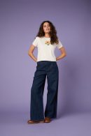 Relaxed style pinstripe jean, a high waisted fit with front tuck details